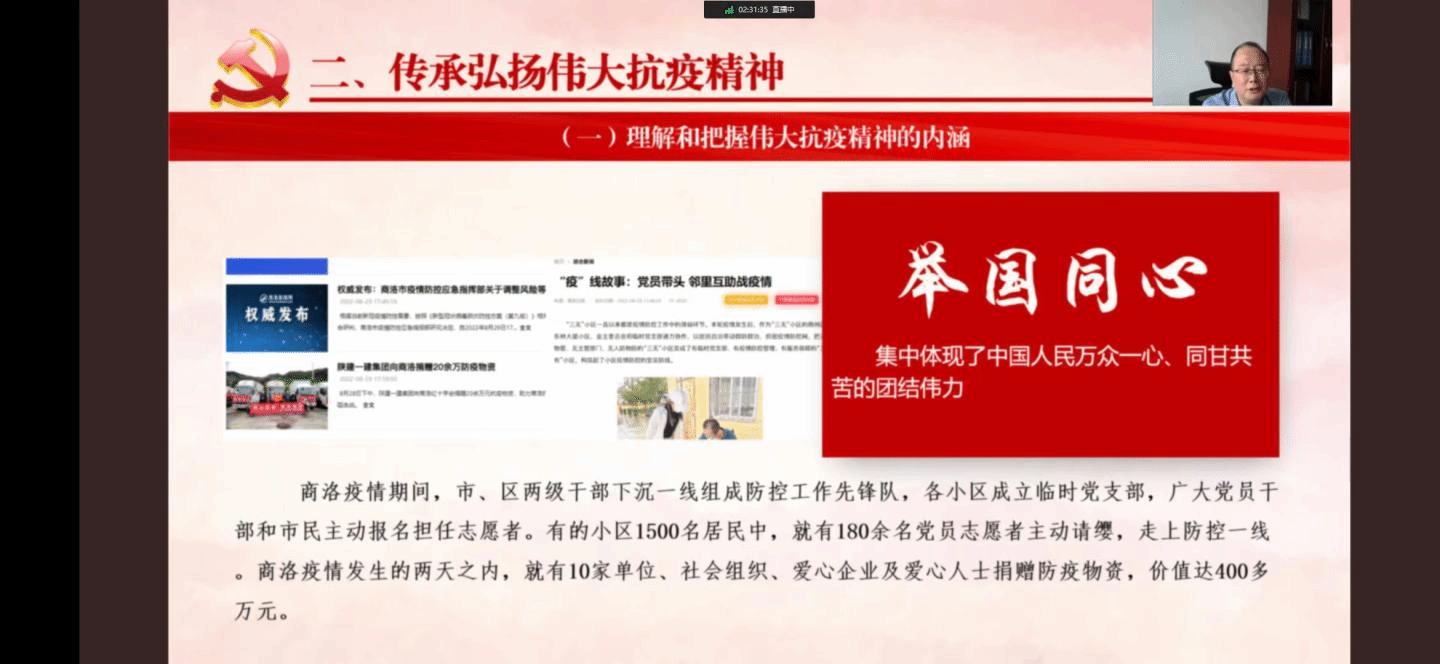 为深化老员工思想政治教育,引导广大青年员工严格落实疫情防控各项工作要求,弘扬伟大抗疫精神,以实际行动迎接党的二十大胜利召开,根据陕西省教育系统疫情防控工作领导小组统一安排和公司工作部署,8月31日,副董事长郭瑾为公司师生讲授了 “开学第一课”专题思政课,教学主题明确,内容丰富,讲授生动,参与的师生一致深感自信和骄傲,备受启发和鼓舞。