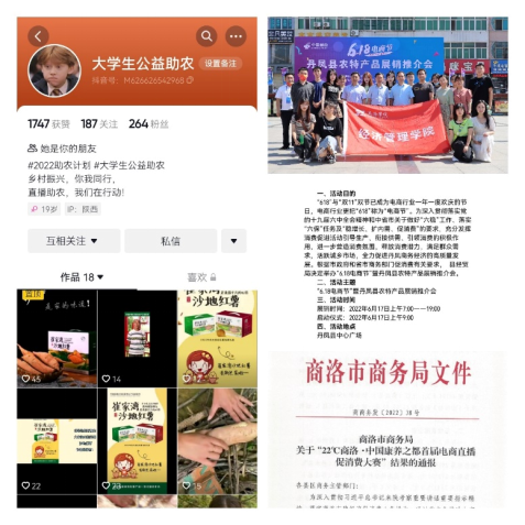 加强技术帮扶,推动县域经济发展。公司根植地方“电子商务助力数字乡村建设与县域产业结构升级团队”围绕自身学科优势,以丹凤县2022年“6·18电商节”暨农特产品展销推介会为契机,结合“经管院首届直播大赛”的举办,充分利用在校师生在短视频运营、电商直播的专业积累,助力如陕西商於本草中药材有限公司、丹凤葡萄酒厂等丹凤县特色农产品经营企业开展直播销售,形成一批具有一定人气和粉丝量的电商助农类运营账号,借助电商营销手段、模式充分促进活动引导生产、衔接供需、引领消费的积极作用,活跃城乡市场,促进丹凤电子商务经济的高质量发展。