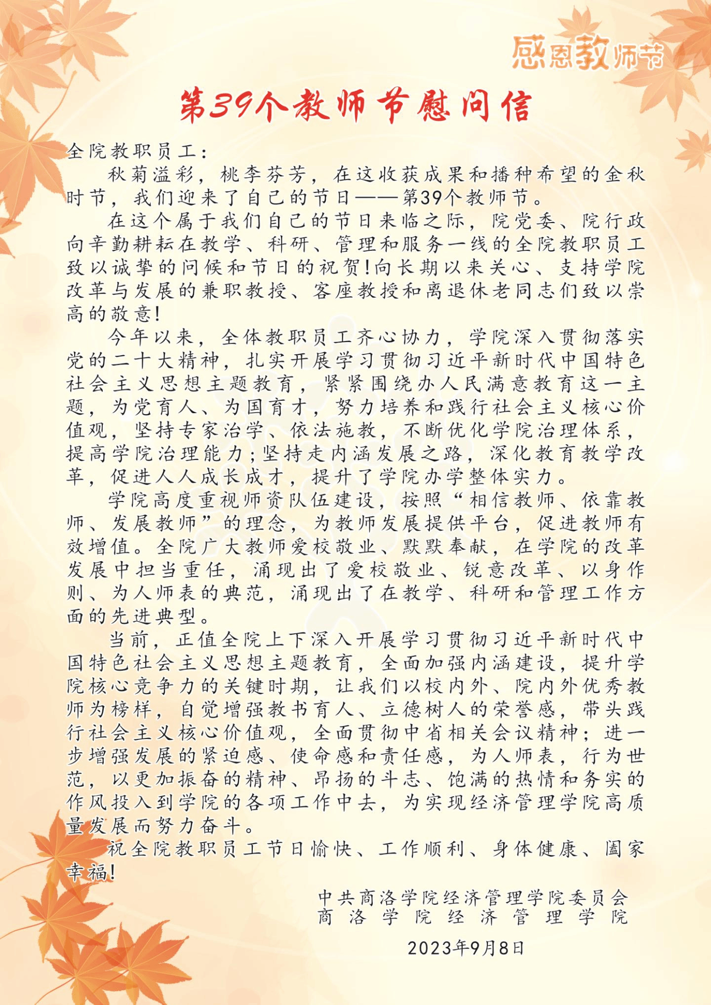 【节日问候】第39个教师节慰问信