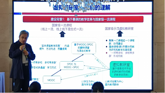 哈尔滨工业大学战德臣教授做了题为《怎样建好虚拟教研室——理解与实践》的专题报告。报告围绕虚拟教研室建设的七大特征、四项建设内容,对虚拟教研室的理解和实践等方面进行了深入解读。