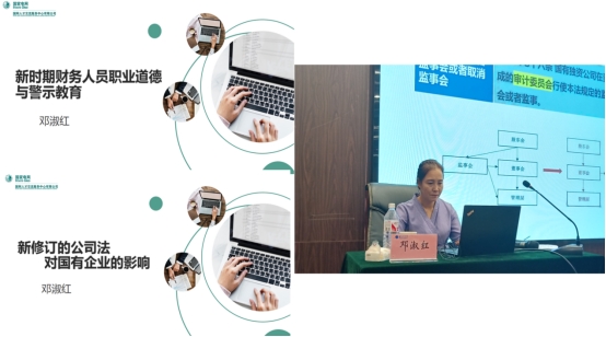 邓淑红讲授了《新时期财务人员职业道德与警示教育》和《新修订的公司法对国有企业的影响》两门课程;李娜娜讲授了《业财融合,让财务数据赋能企业高质量发展》和《财务风险控制与经营分析》两门课程。在国家会计法律法规、公司法、会计人员职业道德相关条款发生新变化的前提下,此次培训目的为了提升行业初级、中级财务人员专业技术水平和职业道德素质。邓淑红、李娜娜老师针对培训要求,精心备课、因材施教,采用线下授课和案例教学的方式,积极与学员进行互动,及时了解国企财务人员学习需求,为他们提供更全面、更专业的财务理论知识,提升他们的业务水平。