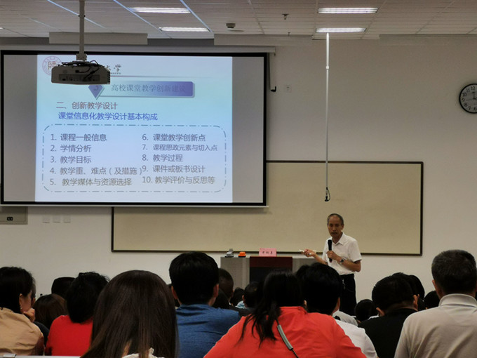 傅钢善教授围绕对高校课堂的几点思考、新时期人才培养新要求、高校课堂教学创新建议等三个方面对新时期教师应具备的专业能力和职业能力给予了详细说明。他首先从厘清教学与科研的关系、如何由“水课”到“金课”、知识传授与课堂育人功能衔接等方面谈了自己从事教育的切身感受,引导广大教师重新认识自己的本职工作:教书育人,真正做到”以生为本“,推进”四个回归“。围绕新时期人才培养的新要求,他提出高校课堂教学创新建议,即理念创新、内容创新、模式创新、方法创新、形态创新、过程创新、评价创新、服务创新,并就教学设计创新进行了系统阐述。