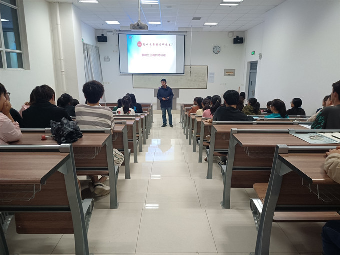 刘龙龙认真分析了为什么要报考研究生、考验趋势及近几年考研录取情况、如何选择专业和公司、如何复习及报名流程和录取规则等方面进行了深入的分析。他指出当今社会越来越重视学历层次的高低,因此考研也就越来越成为本科生的主要需求,他希望大家提高认识,统一思想,提前规划,树立明确的考研目标,在校期间,应加强专业课学习,夯实基础,提前为考研做好准备。