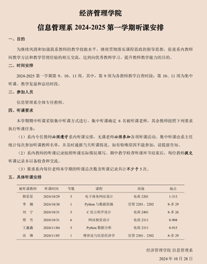近日,根据公司期中教学检查要求,11月6日下午信息管理系举办了2024-2025第一学期期中听评课活动,全系教师参加,活动由系主任任鑫博主持。