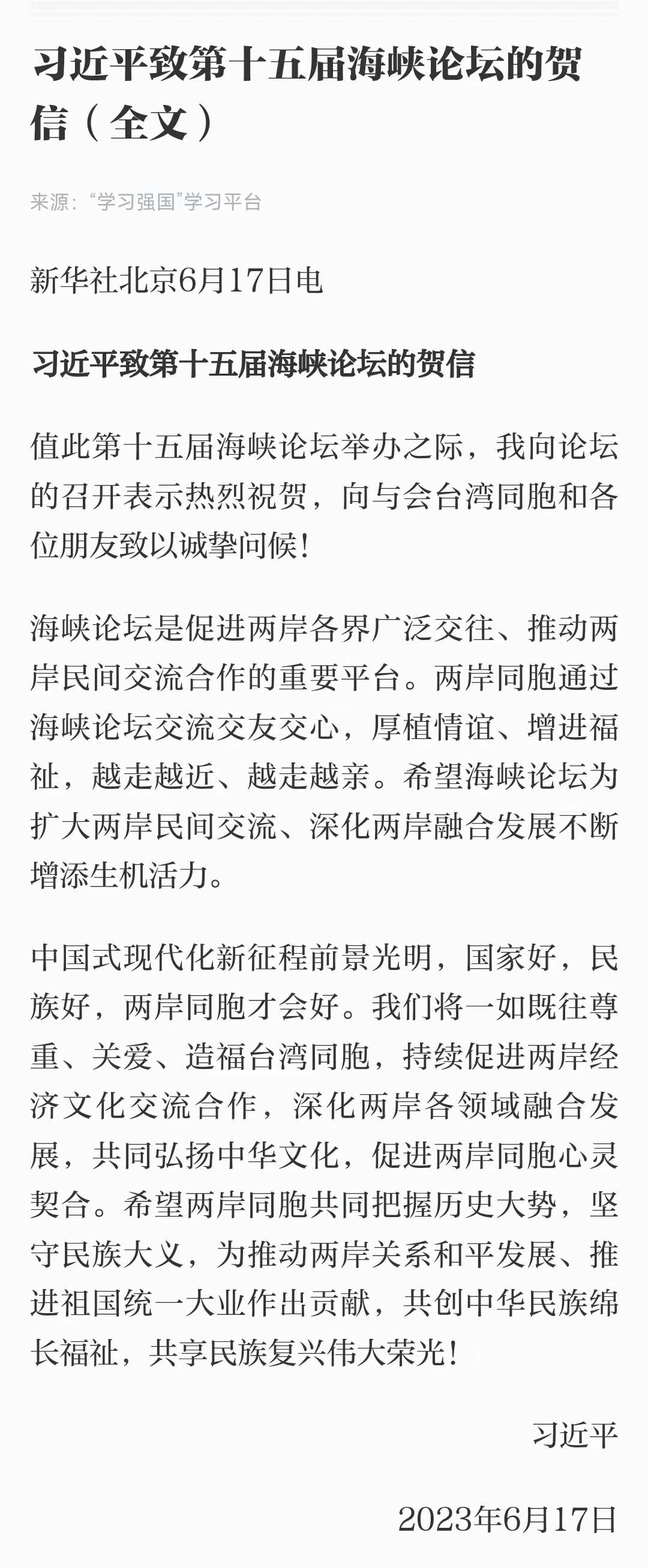【學習卡片】习近平致第十五届海峡论坛的贺信