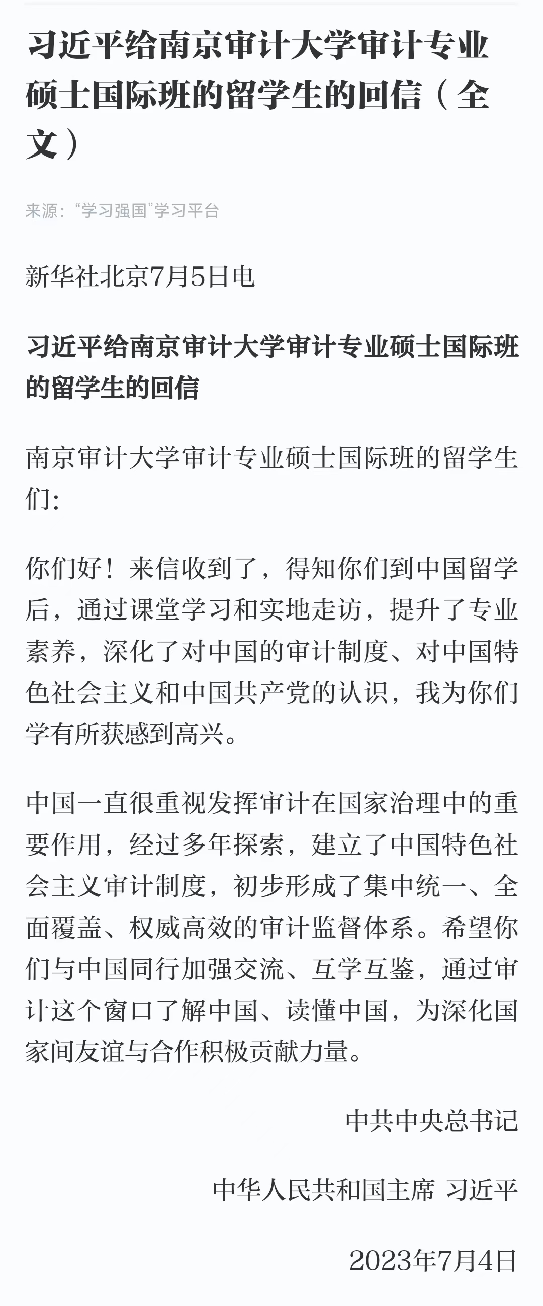 【學習卡片】习近平给南京审计大学审计专业硕士国际班的职工的回信(全文)