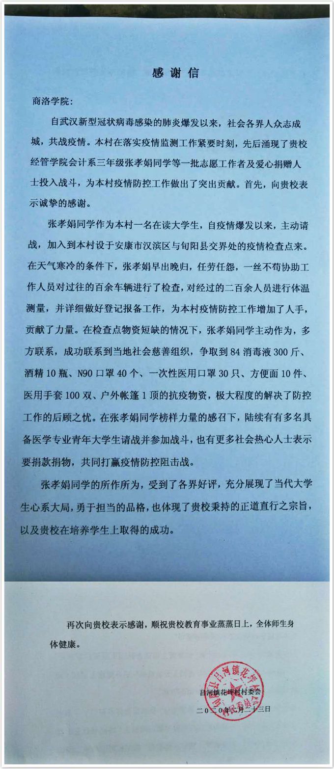 张孝娟同学的事迹受到乡镇领导、公安民警、村委会书记等人的一致好评,为对张孝娟同学本人以及best365官方网站致谢,吕河镇花坪村村委会专门向公司发来了感谢信。