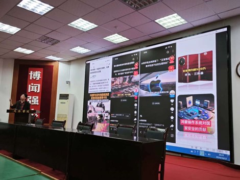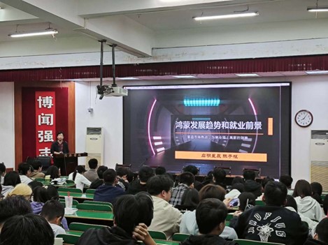 本次招聘会主讲人阵容强大,启明星辰产教融合中心总监孙明虽人在北京,却通过线上方式为同学们进行了精彩的企业介绍。启明星辰蒙安全产线高级工程师陈子书则围绕鸿蒙发展趋势和就业前景,为同学们带来了极具价值的分享。