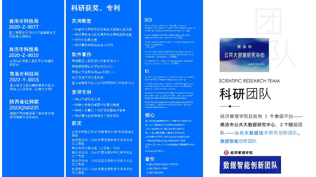 信息管理系紧跟专业前沿领域发展,近五年来专业教师主持或参与省级以上科学研究项目16项,市厅级项目7项,校级项目20余项。纵、横项目到账经费累计200多万元。系内教师积极主动探索最新前沿课题,参加国内、国际学术交流会议,发表国内外论文60余篇,其中11篇被SCI收录,6篇被EI收录,30余篇被核心期刊收录。团队取得了一定的科研成绩,部分成果已经达到国际水平。为进一步培养和造就高水平的科研团队,我系组建“商洛康养大数据安全保护创新团队”“数字经济高质量发展研究团队”“数据智能创新团队”,瞄准国家和区域科技与社会经济发展的战略目标,紧盯当前社会经济发展中的前沿问题积极开展研究。