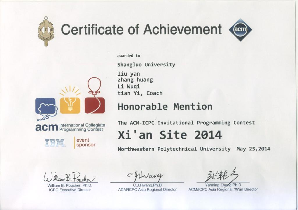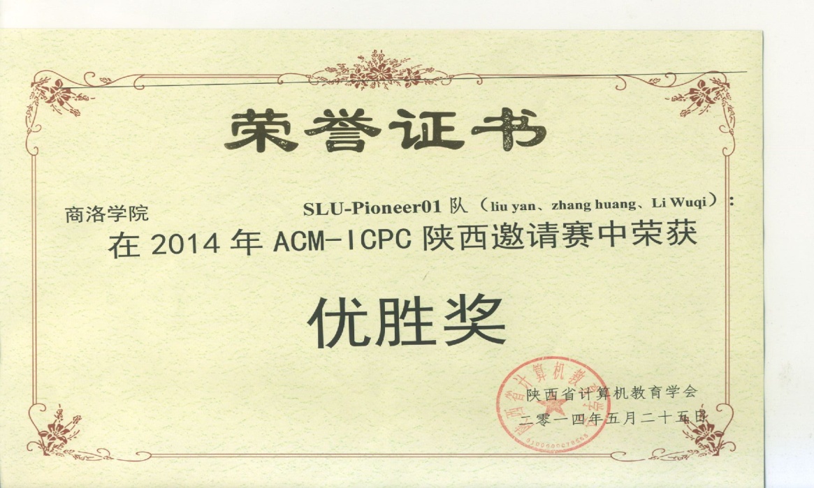 信息管理系员工荣获“ACM国际老员工程序设计竞赛”亚洲区域赛(西安)优胜奖 发布时间:2014-08-25 点击: 第39届“ACM国际老员工程序设计竞赛”成绩揭晓,公司信息管理系SLU-Pioneer01队(刘艳 张煌 李吴奇)荣获优胜奖。