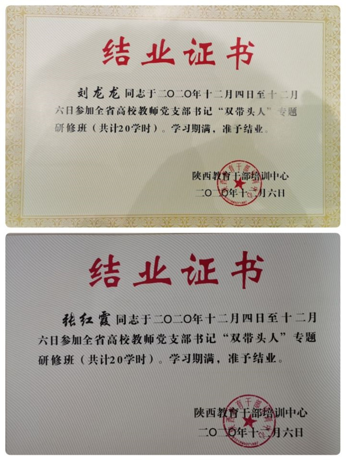 为全面贯彻落实《中共教育部党组关于高校教师党支部书记“双带头人”培养工程的实施意见》各项部署要求,推进全面从严治党向高校基层延伸,提升“双带头人”支部建设能力,更好的发挥教师党支部组织教育管理党员和宣传引导凝聚师生的主体作用,公司组织部组织13名党支部书记参加了由陕西教育干部培训中心组织的全省高校教师党支部书记“双带头人”专题研修班,公司教工第一党支部书记张红霞和教工第三党支部书记刘龙龙参加了此次专题研修并顺利取得了结业证书。