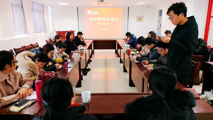 【党建工作】公司各党支部举行主题党日活动 发布时间:2019-02-28 点击: 2月27日下午,公司党总支所辖7个党支部举行了以“旗帜鲜明讲政治”为主题的主题党日活动,全体党员观看了《一抓到底正风纪——秦岭违建整治始末》专题教育片,深入学习了《中国共产党章程》《中国共产党支部工作条例(试行)》《党的十九大报告(全文)》和《中国共产党纪律处分条例》,党员代表段凯、任鑫博、赵彦风作了交流发言,副经理·副书记贾长安作了总结讲话。 (图/文 郭萌 编辑/郭萌 审核/赵健)