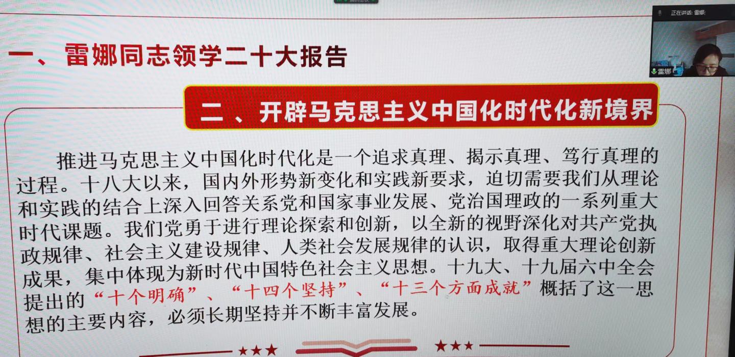 雷娜同志领学了党的二十大报告中第二部分即开辟马克思主义中国化时代化新境界,高扩昌同志领学了《中共商洛市委组织部关于在疫情防控中进一步从严加强党员干部管理的通知》。杨鹏飞和薛羽蒙结合自己的工作实际和防疫抗疫情况就参加员工返校静态管理工作做了交流发言。教工第一党支部书记张红霞为全体党员讲了题为《学习贯彻党的二十大精神五个牢牢把握》的党课。