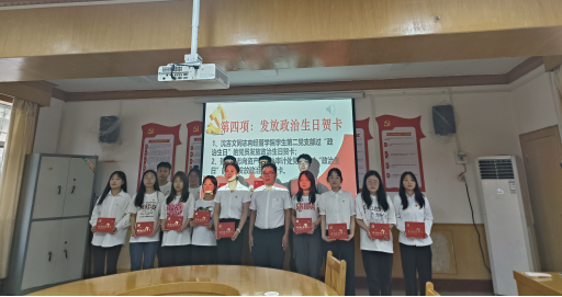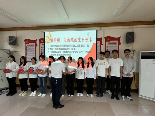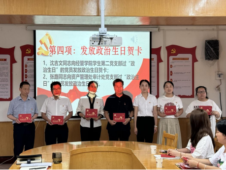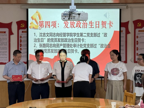 资产管理处审计处联合党支部党员、资产处副处长沈吉文同志向best365员工第二党支部过政治生日的党员颁发了“政治生日”贺卡,送上了生日的祝福和嘱托,希望同志们时刻牢记党员身份,注重党性修养,增强党员意识,争做员工党员的先锋模范。