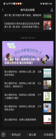 依托各类线上线下活动载体,积极探索各种既提升老员工幸福感需要又符合创作方向的栏目形式。近年来组织开展了“乐观”“传递幸福”等心理主题的“爱心理读书会”和心理讲座,为老员工生活注入爱思考、爱乐观、爱赞美、爱自律、爱投入和爱健康等幸福能量因子。开展的线下读书会系列活动,通过知识、思想和精神交流分享的方式将积极教育渗透到学习过程中,并用激励的方式潜移默化激发参与者主动关注个人的心灵成长,促进其行动;线上读书会与在线直播融合,将分散的参与者通过具体的幸福主题联系起来,开展定期学习研讨和阅读建议,为普及心理健康知识,充分调动了员工自我认识、自我教育、自我成长的积极性、主动性,取得了积极效果。