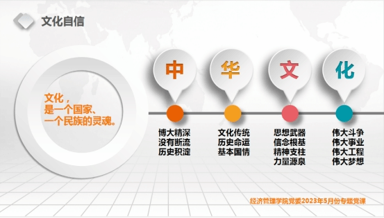 高扩昌同志首先从党的二十大报告、习近平新时代中国特色社会主义思想中“四个自信”的相关论述作为此次专题党课的理论基础,以文化自信为切入点,阐述了中华文化的博大精深和历史积淀,中华文化是思想武器、信念根基、精神支柱和力量源泉,论证了“四个自信”是既自成体系、又一脉相承的有机整体。结合公司5个专业,高扩昌从文化自信的角度提出了“专业共同体”构想,建议各专业抱团取暖、优势互补、树立自信,从课程思政出发,不断探索课堂思政、专业思政的路径,从而扎实落实立德树人根本任务。