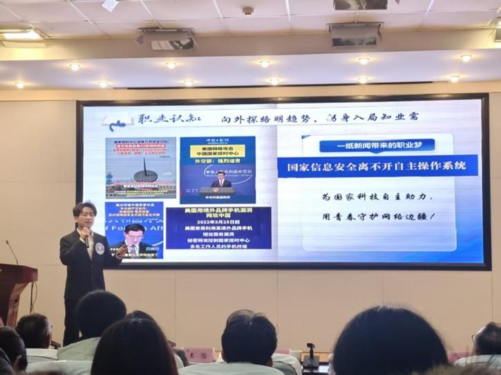比赛现场,张祎凡的职业规划方案以目标明确、路径清晰、贴近实际的特点获得评委关注。他在展示中系统阐述了选择“鸿蒙开发工程师”作为职业方向的原因,深入分析了鸿蒙生态的发展潜力及人才需求趋势,并结合自身实际制定了分阶段成长计划:低年级夯实编程基础、系统学习鸿蒙开发知识;中年级积极参与相关项目实践,提升综合能力;高年级争取实习机会,增强岗位适配度。在答辩环节,他思路清晰、应答从容,围绕专业技能储备、职业素养培养及长远发展规划进行全面阐述,充分展现了对未来职业发展的深入思考与坚定追求,赢得了评委的一致认可。
